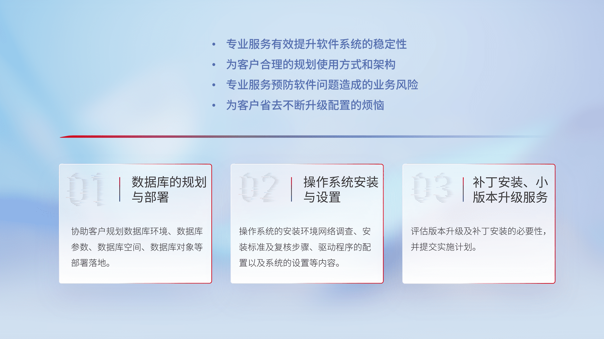 为客户提供软件规模升级、、、快速部署、、按需配置的专业服务,,,从数据库的规划与部署到操作系统的安装与设置,,再到补丁安装和小版本升级提供支持。。。
